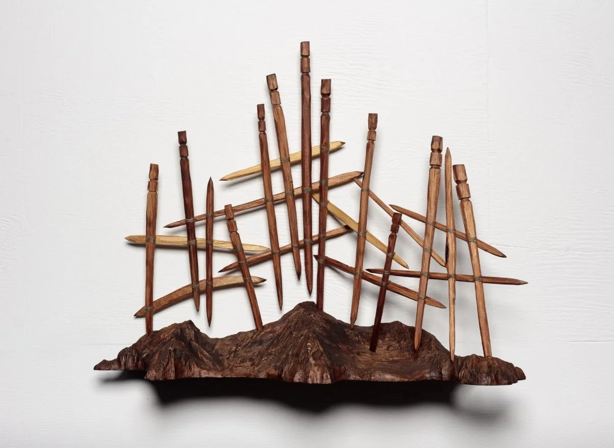 In his exhibition I. Object. at PAULNACHE, Conor’s latest works are a mix of found materials and reclaimed native woods used to create inspiring sculptural carved Rimu Palisades (defensive wall), Whare (meeting house) and Maunga (mountainous landscapes) that appear to hover allowing playful light and shadow to illuminate these simplified forms and their significance. His work can be discovered in collections throughout Aotearoa and around the world.
