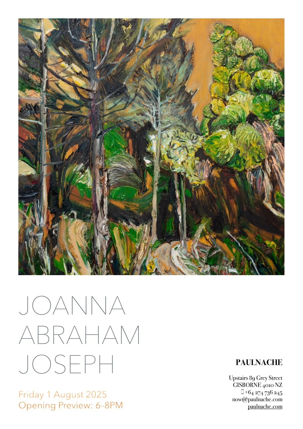An exhibition of new paintings by Joanna Abraham Joseph, titled "Leave The Trees," is about to open at PAULNACHE, Gisborne on Friday 1 August 2025, 6-8pm.