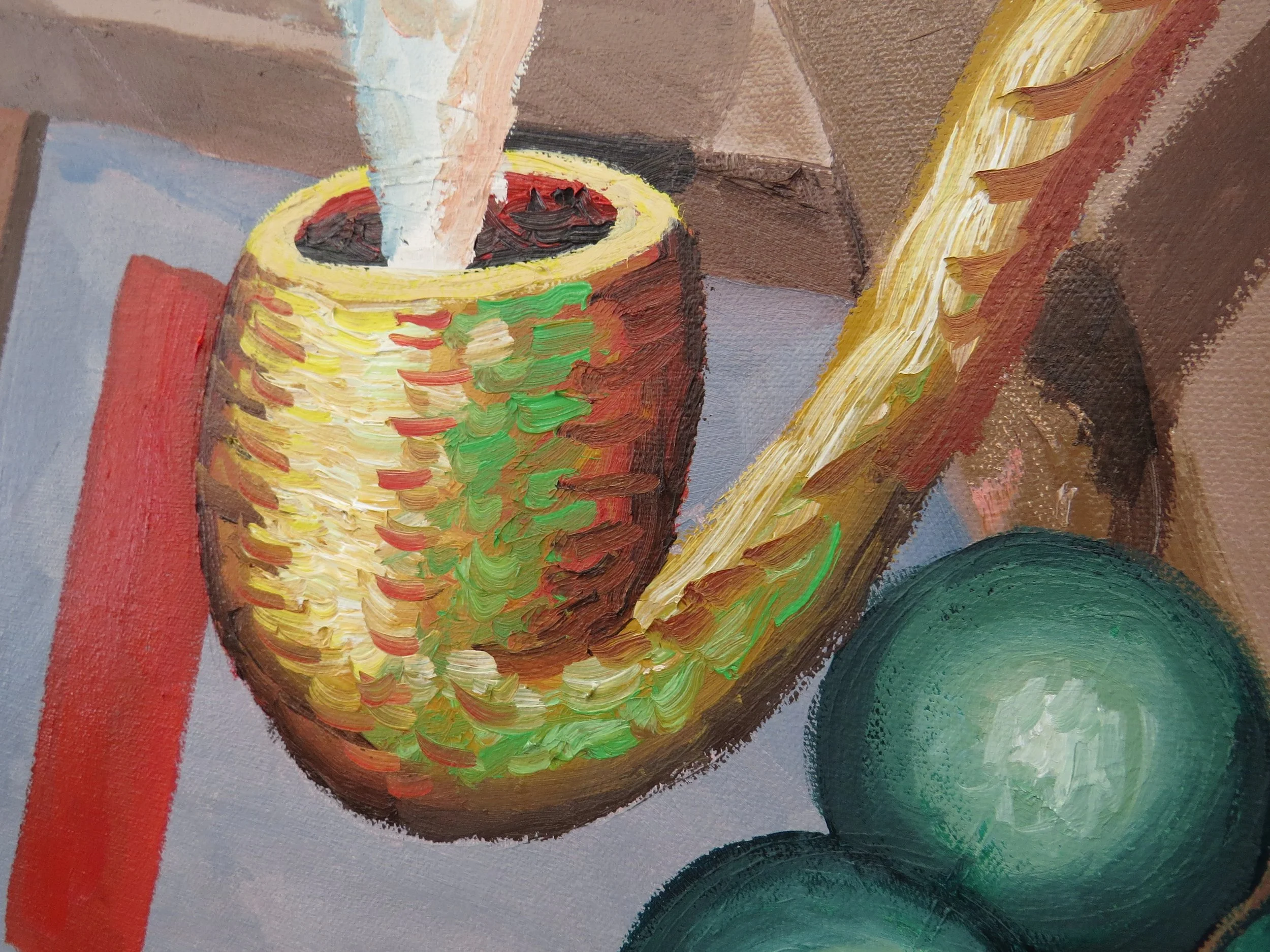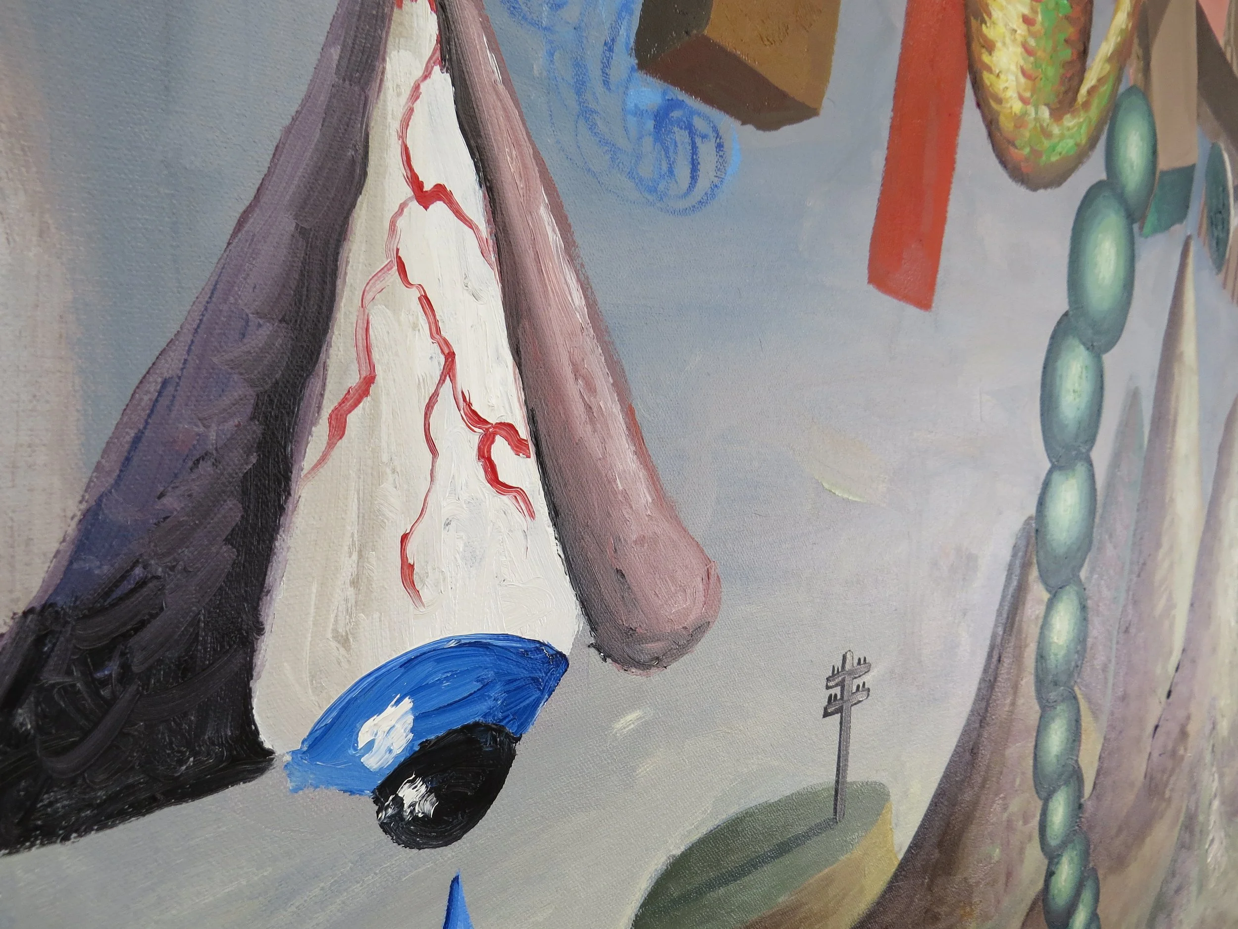 From the middle of 2019, desert island landscapes, moody skies enveloped with plumes of smoke, eyeballs with decorative tears, nails and Malevich-like constructions inhabit the canvases. Modes of survival are presented in tools such as the fire-starting bow drill and the ominous shark fin in the surrounding sea. Constructions provide shelter.