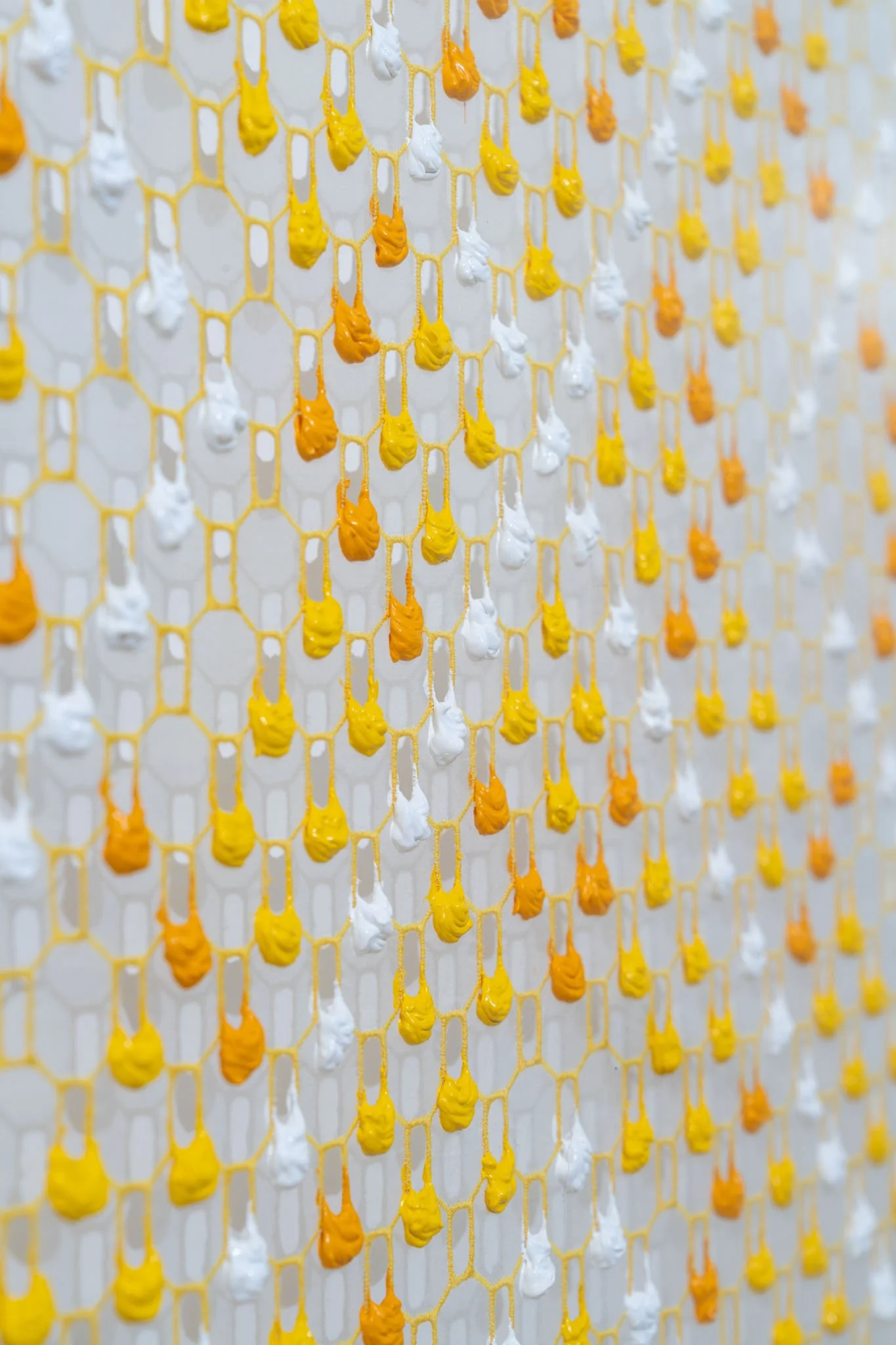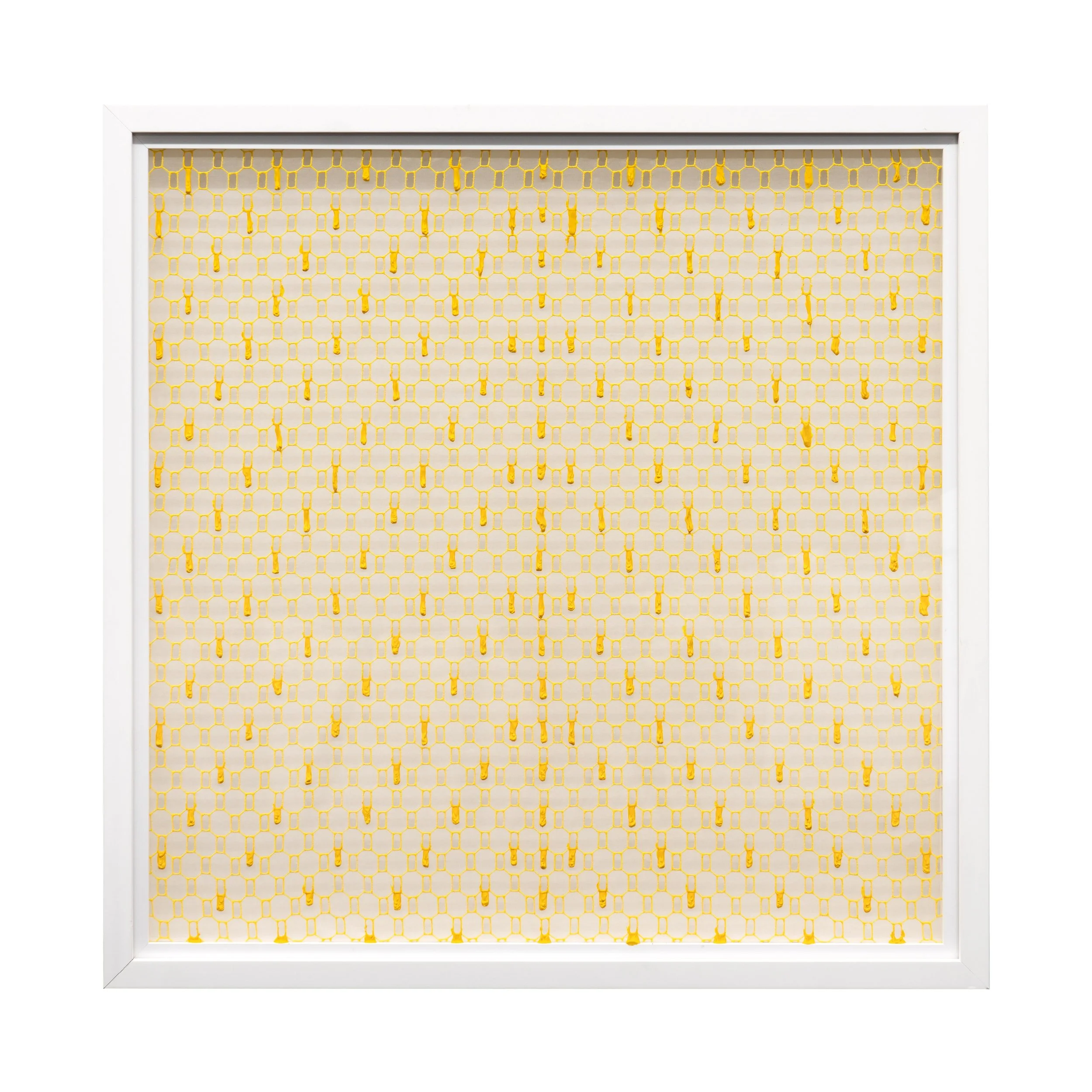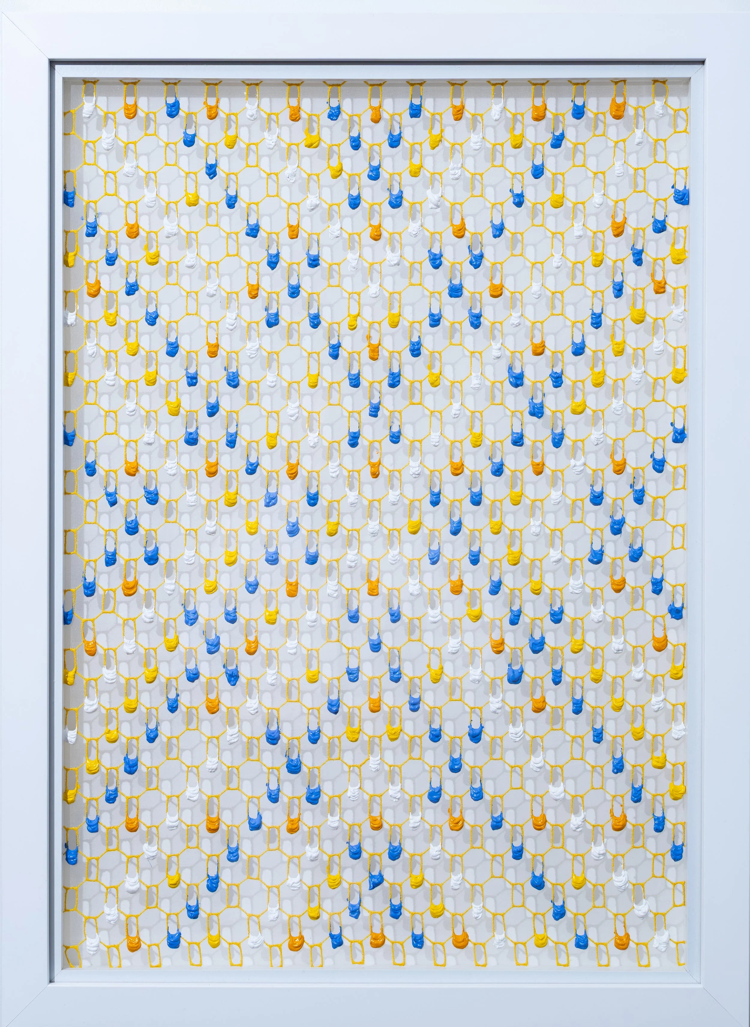 At the heart of Larkin’s practice is the use of paint in a way that exploits its physical properties in order to illustrate the artist’s chosen concepts. In early works, paint is pushed through the apertures in painted mesh to create painterly ‘pixels’ on the surface of each work whilst her new work has drips of paint suspended on embroidered transparent silk.