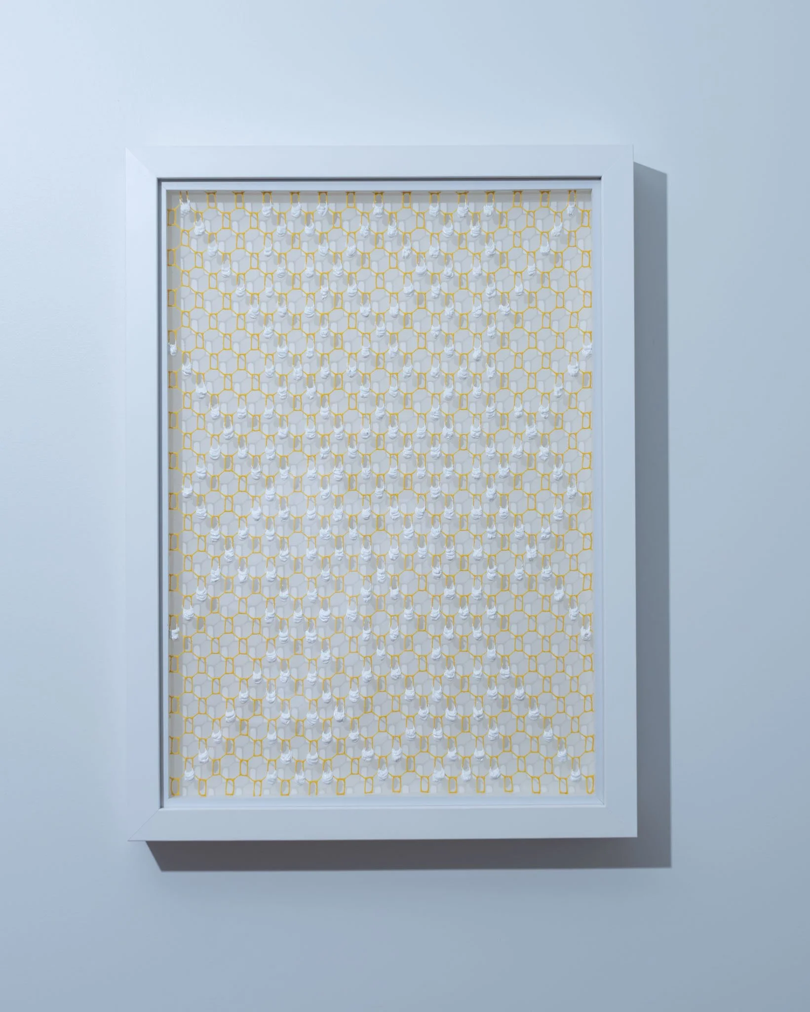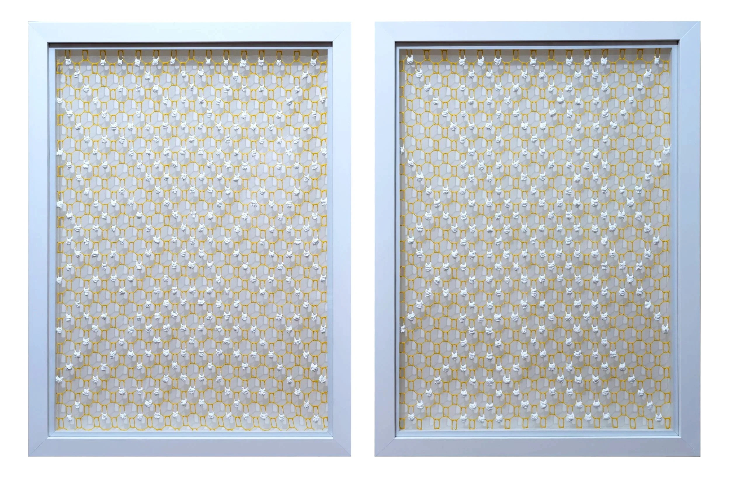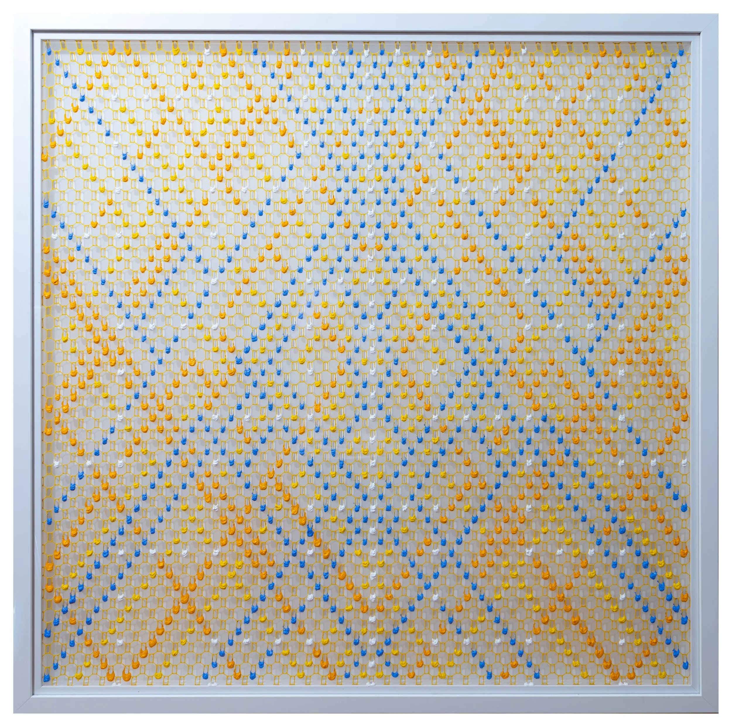 At the heart of Larkin’s practice is the use of paint in a way that exploits its physical properties in order to illustrate the artist’s chosen concepts. In early works, paint is pushed through the apertures in painted mesh to create painterly ‘pixels’ on the surface of each work whilst her new work has drips of paint suspended on embroidered transparent silk.